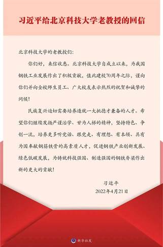 中共中央总书记、国家主席、中央军委主席习近平4月21日给北京科技大学的老教授回信,对培养更多高素质人才,促进钢铁产业创新发展、绿色低碳发展提出殷切期望。
